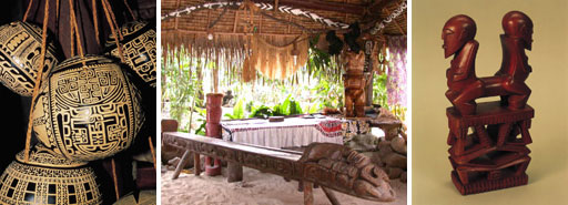 C'est de la tradition que viennent l'art des percussions sonores issues des grands pahu à la voix grave et desto'ere crépitants, l'art des beaux tatouages complexes. Et l'art des bois sculptés marquisiens, enfants des grands tikis de pierre toujours dressés, parmi les laves des anciens marae, au fond des vallées secrètes.