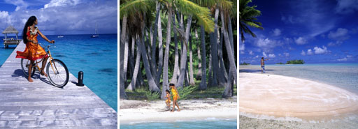 L’archipel des Tuamotu, un univers particulier entre ciel et océan, est un ensemble d’îles basses, ou "atolls" refermés sur leur lagon par une ceinture de corail. Bleu, blanc, vert : les trois couleurs dominantes de l’archipel des Tuamotu, simples anneaux de corail, posés, comme en suspens, entre ciel et vagues. De plus près, la féerie explose : c’est le dégradé turquoise des lagons, les violets et les mauves des platiers coralliens affleurant la surface irisée d’une eau jade translucide, les taches jaunes, rouges, oranges, noires, roses des jardins sous-marins, et les fulgurances nacrées des poissons. Il y pleut rarement. C’est un milieu propice à la culture des nacres perlières. Rangiroa, Tikehau, Manihi, et Fakarava sont les plus visitées.