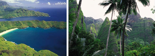 Der Archipel der Marquesas-Inseln liegt in Äquatornähe. Die Natur der 12 Marquesas-Inseln ist geprägt von steil aufragenden Vulkanbergen, tiefen Schluchten und von schroffen Felswänden. Die wilde Landschaft dieser Inseln, auf denen Pferde und Ziegen frei leben, gehört zu den unvergleichlichen Schätzen Polynesiens. Auch der Maler Paul Gauguin und der Chansonier Jacques Brel haben sich in die Inseln verliebt. Zu den wichtigsten Inseln zählen Nuku Hiva, Ua Pou, Ua Huka und Hiva Oa.