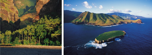 Der Archipel der Marquesas oder auch "Land der Männer" (auf polynesisch "Enua Enata"), ist eine Gruppe von Gebirgsinseln, die wie dunkelgrüne Trutzburgen aus dem großen indigoblauen Ozean aufragen. In unmittelbarer Nähe des Äquators und 1500 km von Tahiti enfernt sind von den zwölf der Marquesas-Inseln nur sechs bewohnt.