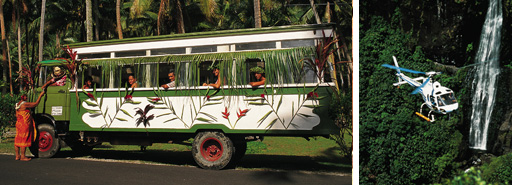 Transport auf den Inseln: In Tahiti stehen moderne Busse und Taxis zur Verfügung. Mann kann auch bei einem der vielen Verleiher ein Auto, einen Geländewagen oder ein Motorrad meiten. Auf den anderen Inseln des Archipels verkehren Trucks, das sind pittoreske, zu Bussen umgebaute Lastwagen mit Holzflanken, zu allen Dörfern. Und je nach Insel bietet sich immer ein Ausflug mit dem Fahrrad oder zu Pferd auf der Suche nach versteckten Paradiesen an.