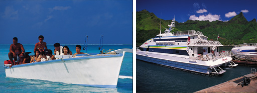 Katamarane und Fähren bieten mehrmals täglich einen Pendelverkehr zwischen Tahiti und Moorea an. Die Dauer der Überfahrt beträgt je nach Anbieter ca. 30 Minuten bis 1 Stunde. Es wird empfohlen die Abfahrtszeiten vor Ort noch einmal bestätigen zu lassen:
